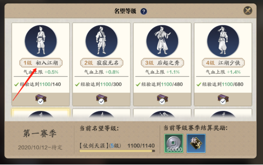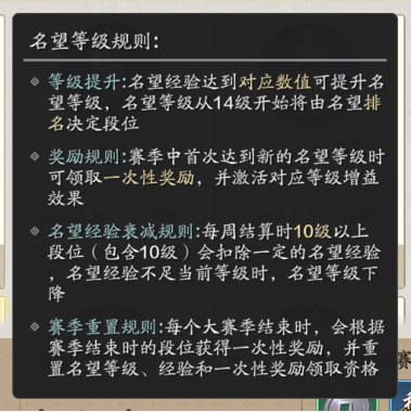 Cấp độ danh vọng của phe phái bị giới hạn theo thời gian và cấp độ. Sau khi cấp độ danh vọng đạt 14 trở lên, thứ hạng sẽ được xác định bởi xếp hạng danh vọng; vào cuối mỗi mùa giải, cấp độ danh vọng, kinh nghiệm và khả năng đủ điều kiện nhận phần thưởng một lần của bạn sẽ được đặt lại. Vào cuối mùa giải, bạn sẽ nhận được phần thưởng xếp hạng một lần dựa trên thứ hạng của bạn.