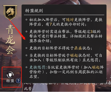 Ngoài ra, bang phái cũng có thể được thay thế, nhưng cần đáp ứng một số hạn chế nhất định. Ví dụ: trong vòng 7 ngày sau khi đổi bang phái không được đổi lại, trạng thái của bang phái mục tiêu đổi không được ở đỉnh cao, sau khi đổi phái sẽ bị trừ một phần trăm nhất định vào danh vọng thu được trong tuần, v.v.